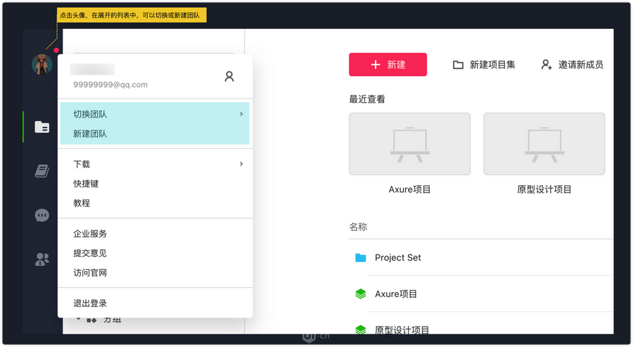 如果想要切换团队或新建团队,点击头像,在展开的面板里可以进行相应操作~