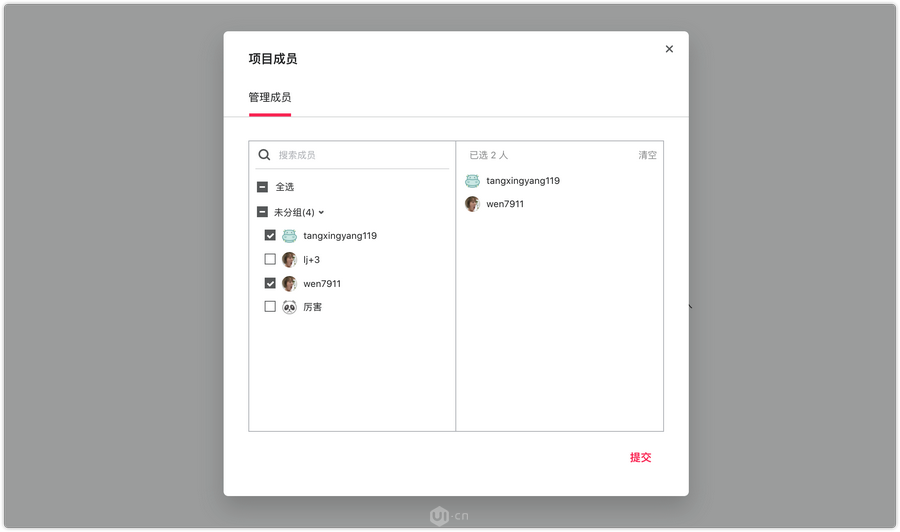 在项目内,可以添加或删除项目成员。本次升级,我们对增删项目成员的界面也进行了优化,树状结构的选择器,左侧为非项目内成员,勾选后会自动添加到右侧列表中,查看起来非常方便。