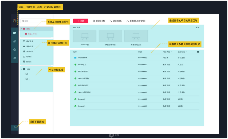 本次升级,我们对项目首页分区进行了新的设计,最近查看的项目会展示在最上方。新的分区可参考下图标注进行了解哦: