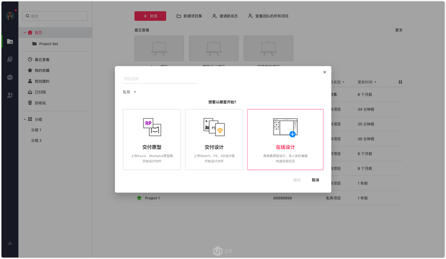 除了界面上的改版,我们还对原有的第三方原型项目、协作项目及在线原型项目,做了一次大整合。新建项目时,你可以将Axure、Mockplus的原型上传到项目中,将Sketch、PS或XD的设计稿上传到项目中,还可以直接开启在线原型设计。