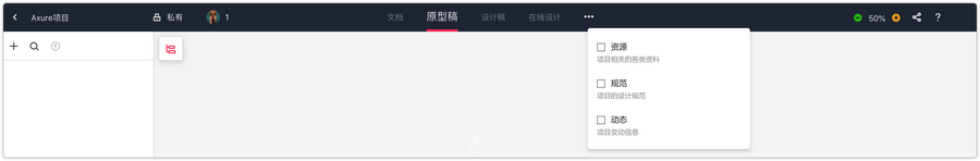 另外,进入项目内,导航栏的分布和以往也有很大区别。默认展示“文档”、“原型稿”、“设计稿”、“在线设计”四个标签,如果想查看其它标签下的内容,对标签前的复选框勾选上就可以了。