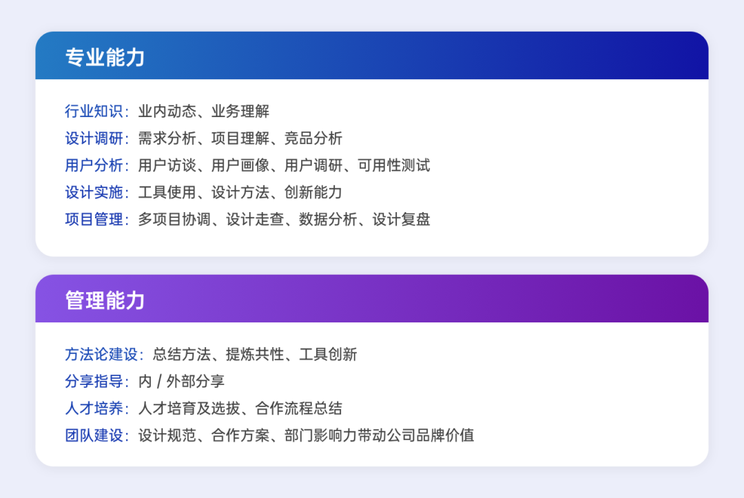 上图是比较常规的设计师能力考察点。在实操中可以根据公司的情况,对自己内容的侧重点的进行重新分配,并补上缺失的内容,就算是做到了有的放矢。