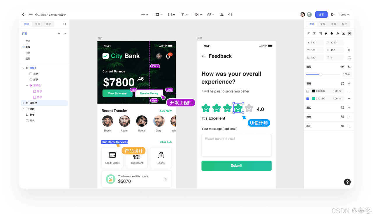 推荐理由:Figma功能强大,协作性出色,还有庞大的社区交流学习,是一款非常优秀的UI设计工具。有点小遗憾的是,它的服务器在国外,对国内用户有网络访问等限制,因此给到四星半。