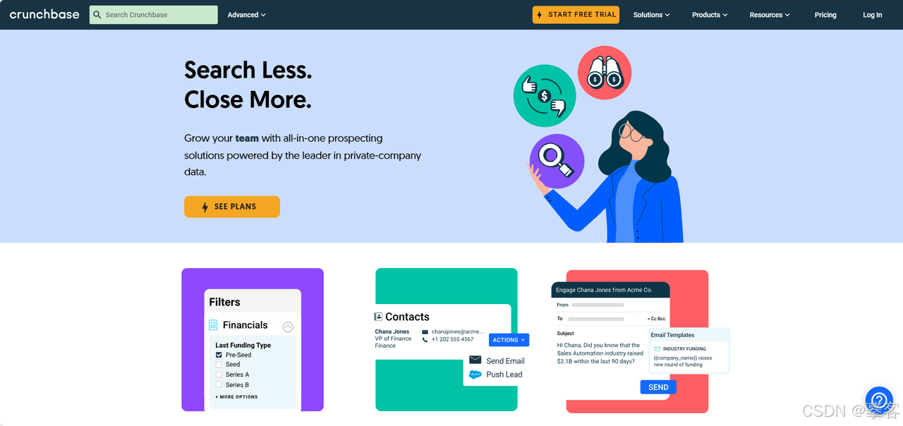 Crunchbase一家提供公司和行业数据的平台,产品经理可以通过该平台获取竞品信息、了解投融资情况。目前,Crunchbase收录了超过600,000 家公司的数据,涵盖740+多个行业品类。是世界上最大的企业信息数据库之一。