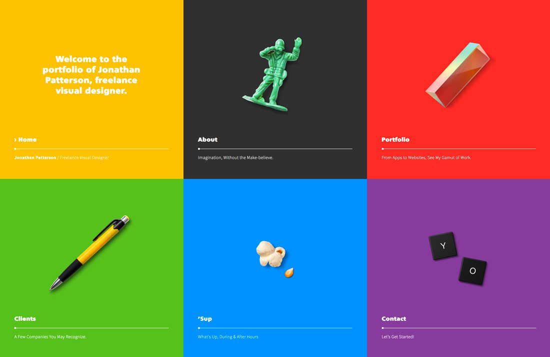 乔纳森帕特森的着陆页使用动画来建立CTA – 当光标悬停在明亮的彩色块上,色块变为黑色提示用户可以点击获取更多信息。