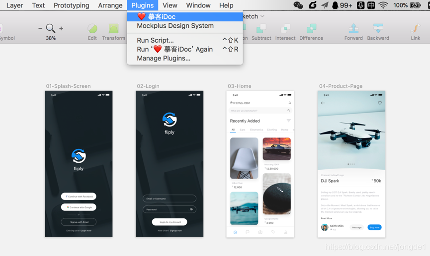 在摹客官网(https://idoc.mockplus.cn/download)下载摹客iDoc Sketch插件安装文件并点击进行安装。插件安装好后打开Sketch,在「Plugins插件」中找到摹客 iDoc 插件,选择并打开。