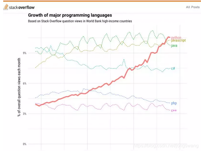 Stack Overflow 发现其 38.8% 的用户在各自的项目主要使用 Python。根据该网站的调查,2018 年 Python 的受欢迎程度超过了 C#(于 2017 年超过了 PHP)。