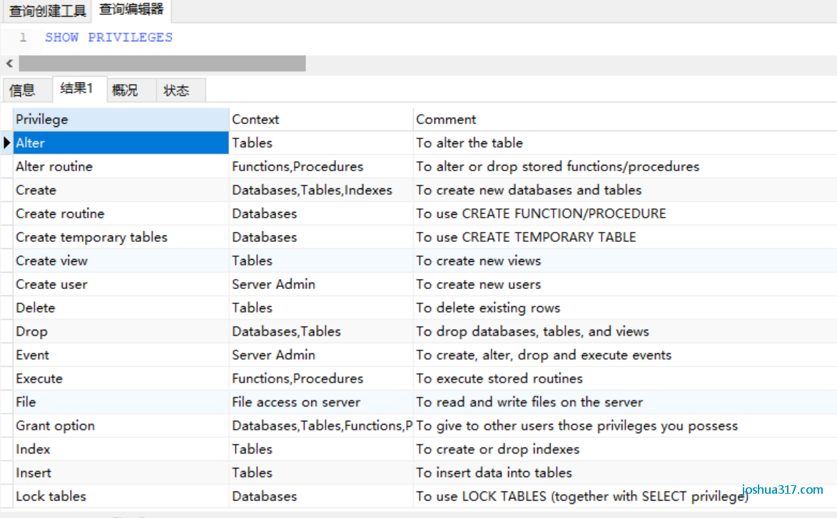 ● Show view:该权限用于执行SHOW CREATE VIEW语句。对视图使用EXPLAIN语句也需要此权限。