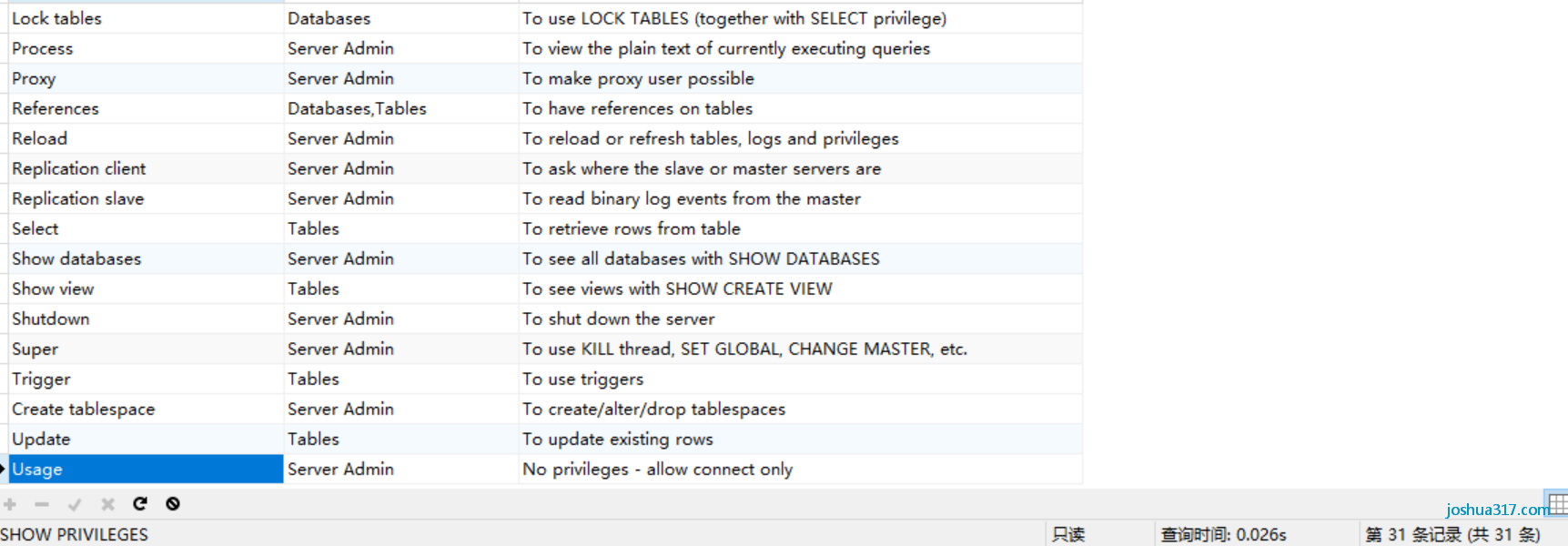 ● Usage:该权限代表用户“无任何权限”。全局级别权限,拥有该权限的用户可以登录到数据库服务器中,但在默认配置下除能够执行部分show命令之外,其他任何数据变更和数据库查询操作都无法执行。