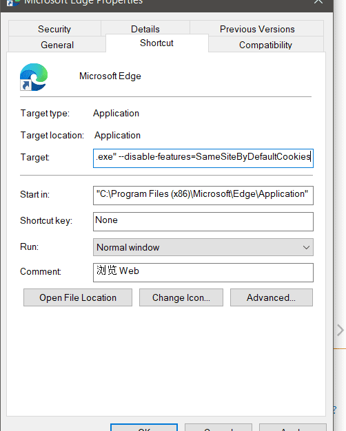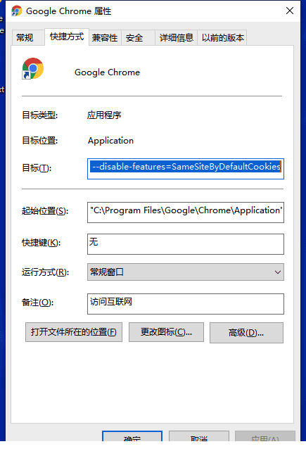 右键单击Chrome快捷方式,打开属性,在目标后添加–disable-features=SameSiteByDefaultCookies,点击确定,重启Chrome即可。