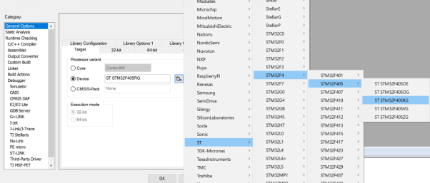 在General Options > Target > Device选择对应的MCU型号(以STM32F405RG为例):