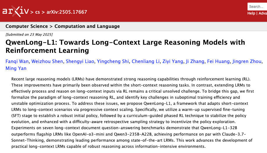 阿里又开源新模型了,这次是通义千问文档团队带来的 QwenLong-L1-32B——首个通过强化学习训练、专为长上下文推理设计的大语言模型。
