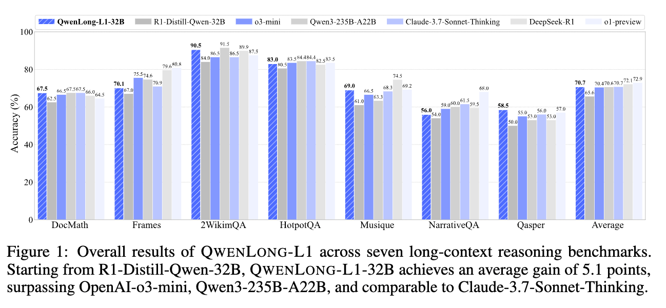 在七个长上下文文档问答基准测试上的实验表明,QwenLong - L1 - 32B 优于 OpenAI - o3 - mini 和 Qwen3 - 235B - A22B 等旗舰大推理模型,性能与 Claude - 3.7 - Sonnet - Thinking 相当,在当前最先进的大推理模型中表现领先。