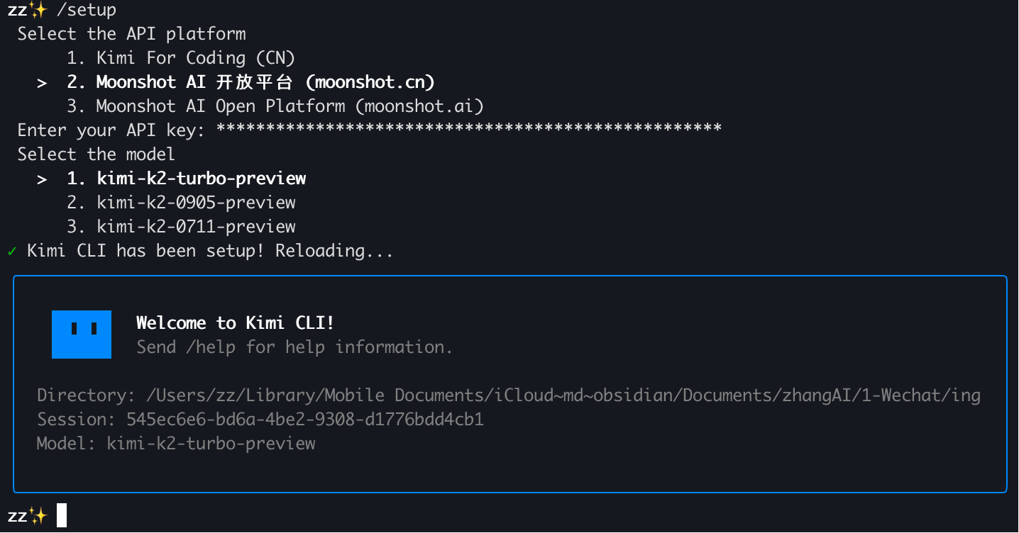 - /setup: 设置 Kimi CLI