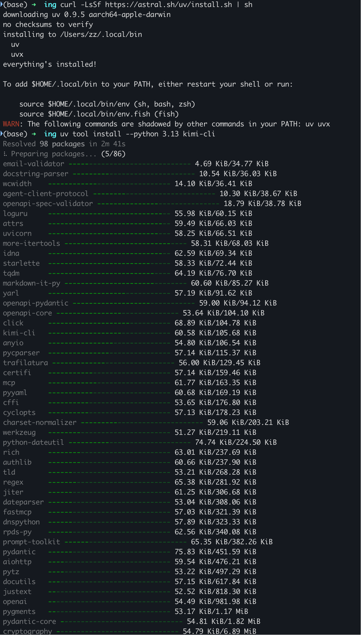 warning: /Users/zz/.local/bin is not on your PATH. To use installed tools, run export PATH="/Users/zz/.local/bin:$PATH" or uv tool update-shell.