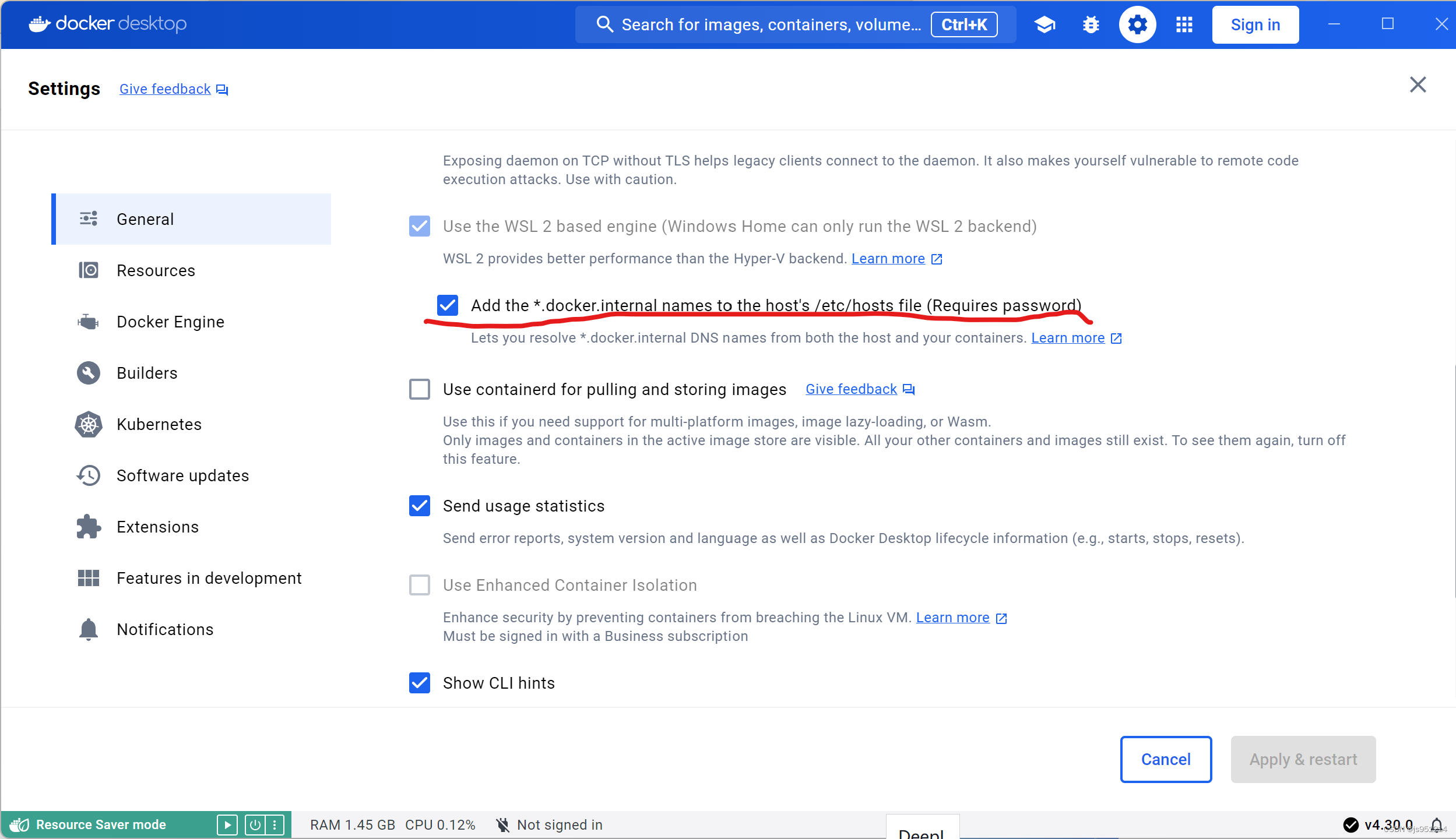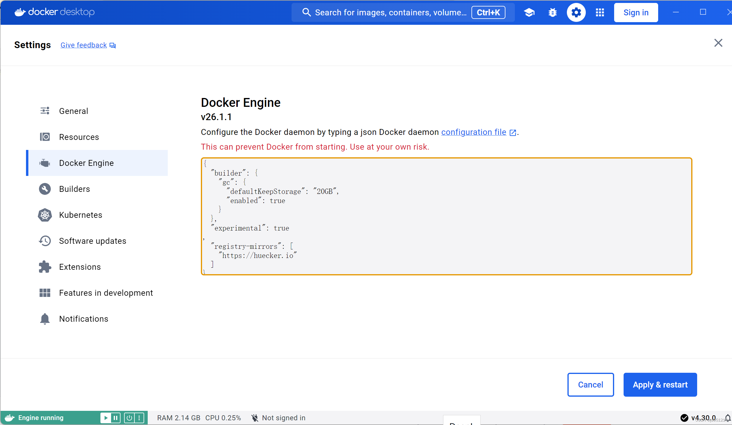注意"registry-mirrors"的前面应加英文逗号“,” 作分隔。点击右下角Apply&restart应用。