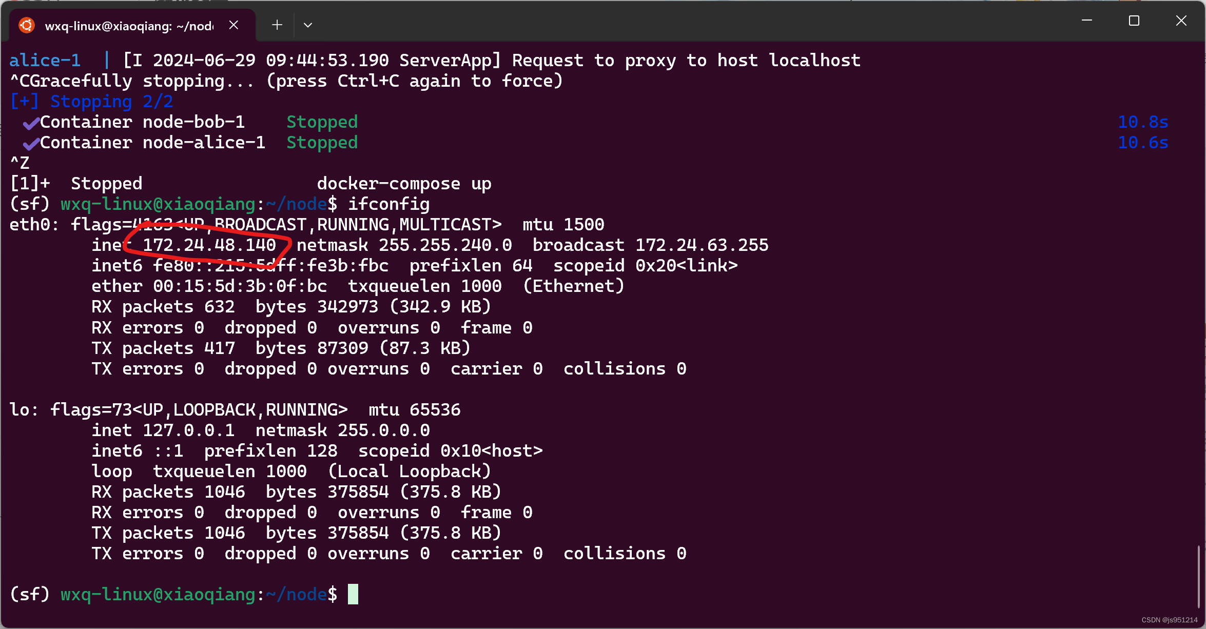 命令行界面输入ifconfig查看以太网IP地址: