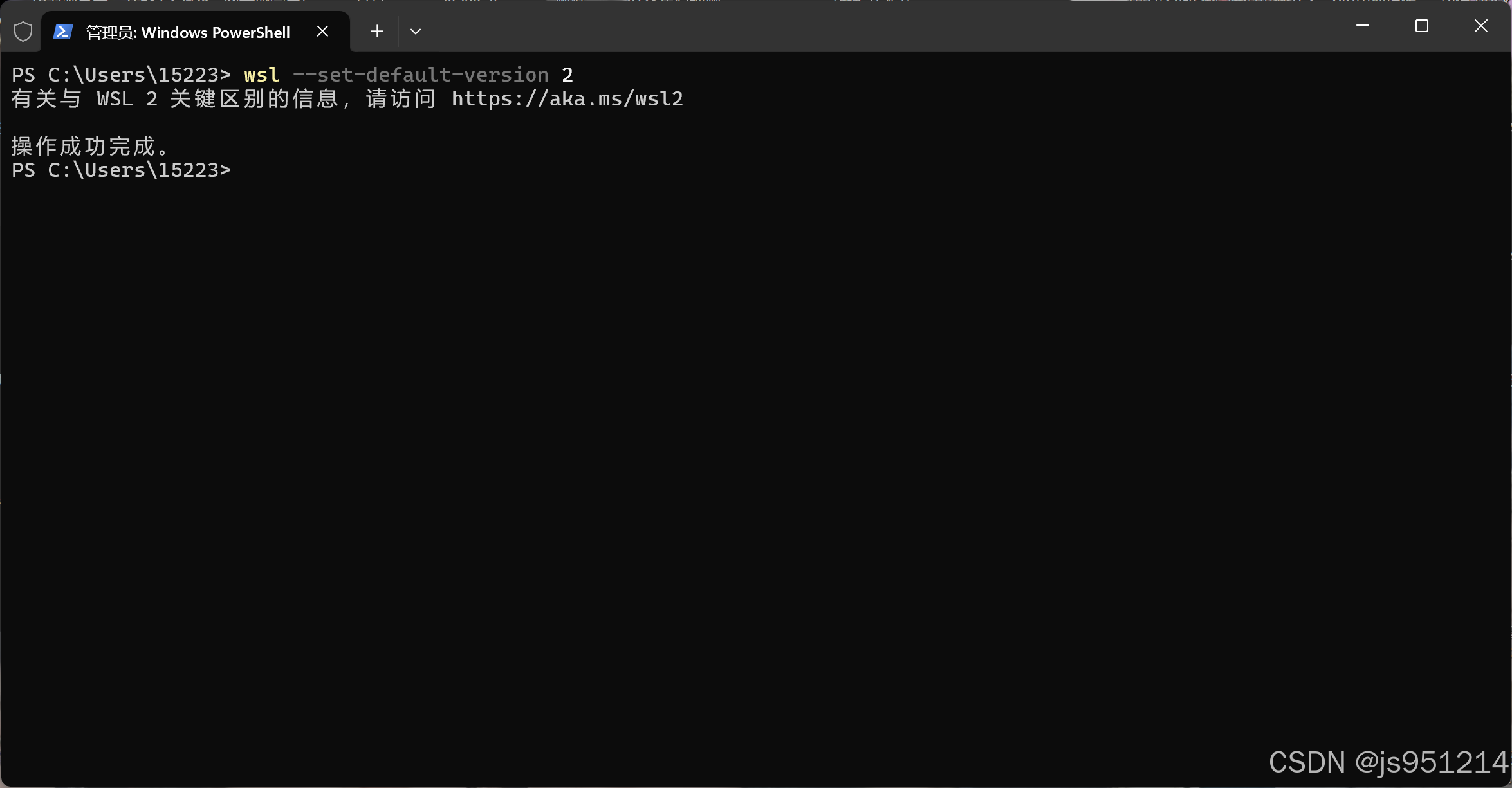 打开 PowerShell,然后在安装新的 Linux 发行版时运行以下命令,将 WSL 2 设置为默认版本:
