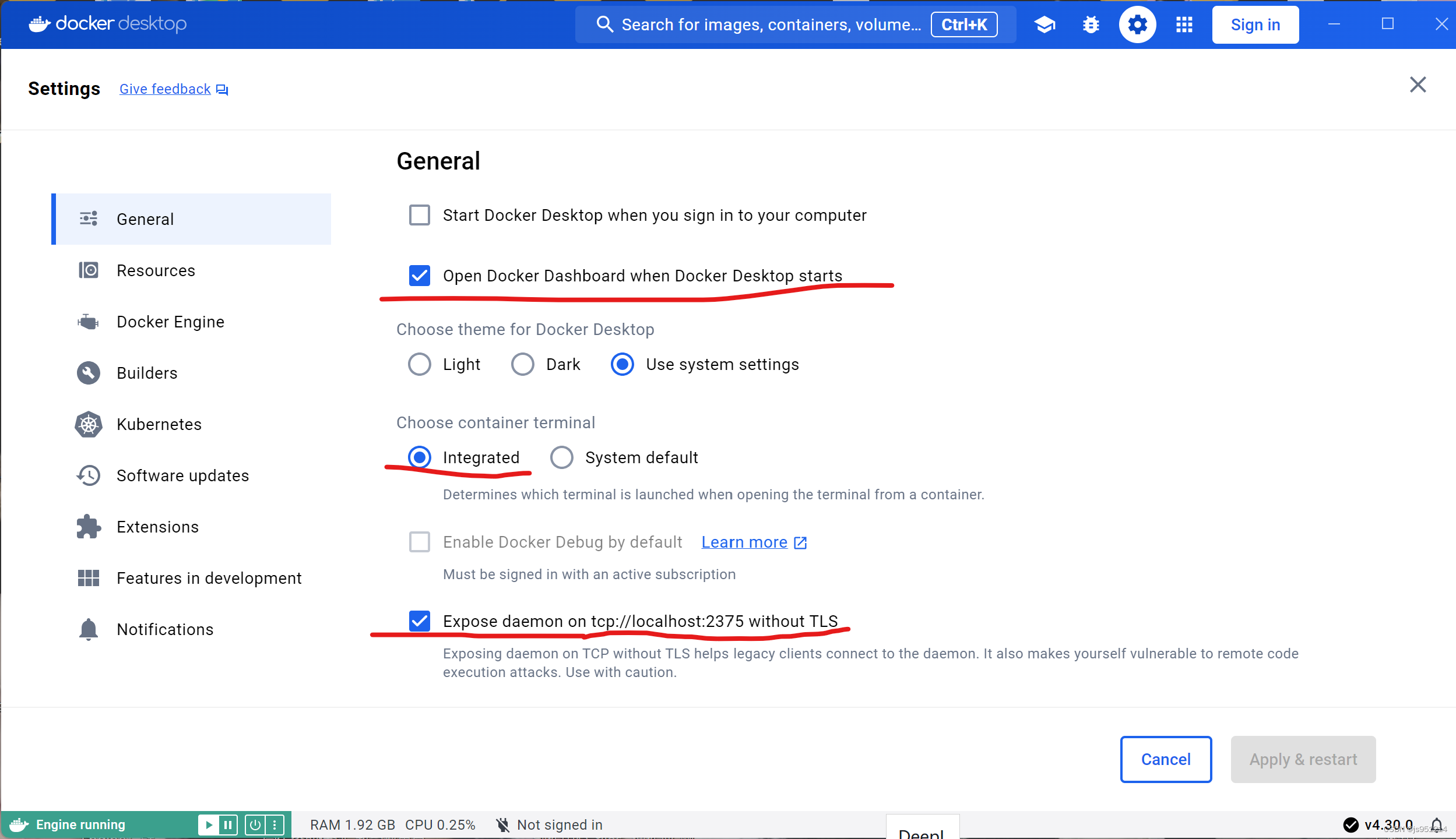 1.下载Docker Desktop(Docker Desktop Installer.exe)点击链接下载docker-for-windows版本的安装包。打开下载好的exe文件,等待安装完成后,在Settings界面勾选以下设置