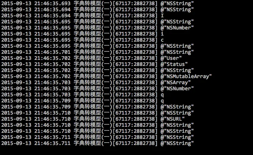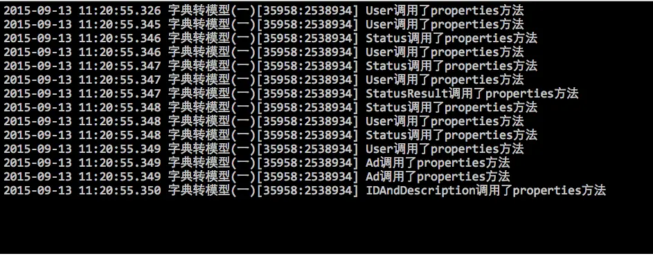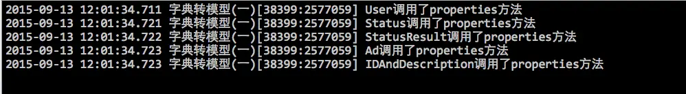 将5个字典转模型的例子同时进行运行,在+ properties方法中添加一句打印.另外之前的例子都是有内存泄露的,这里添加了free(properties)修复了这个问题.