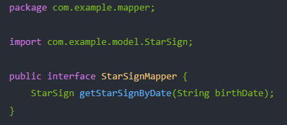 StarSignMapper 接口是与数据库交互的接口,定义了一个方法 getStarSignByDate 用于根据生日查询星座: