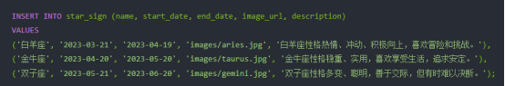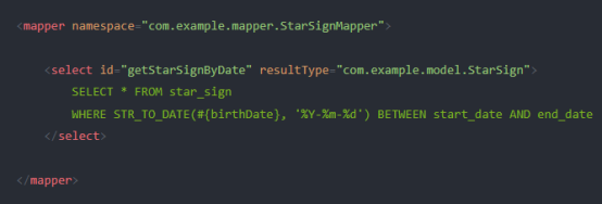 在 MyBatis 的映射文件中,定义了查询星座的 SQL 语句。根据用户输入的日期,查询对应的星座: