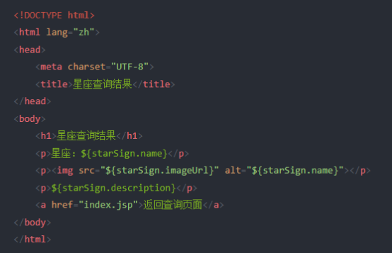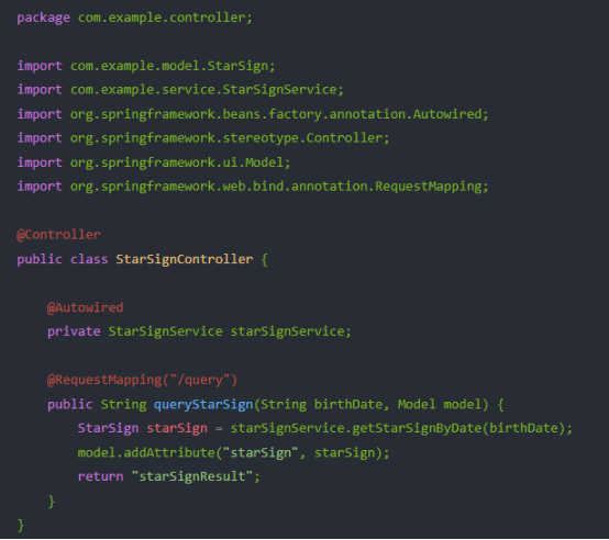 StarSignController 是处理用户请求的控制器,它接收用户输入的生日,并返回查询结果页面: