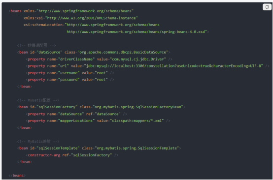 我们通过 Spring 配置文件来配置数据源和MyBatis的相关内容: