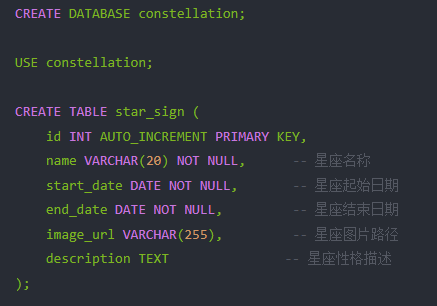 我们首先需要设计一个数据库,并创建一张表用于存储星座信息。在这里,我们创建了一个名为 constellation 的数据库,其中包含一个 star_sign 的表。