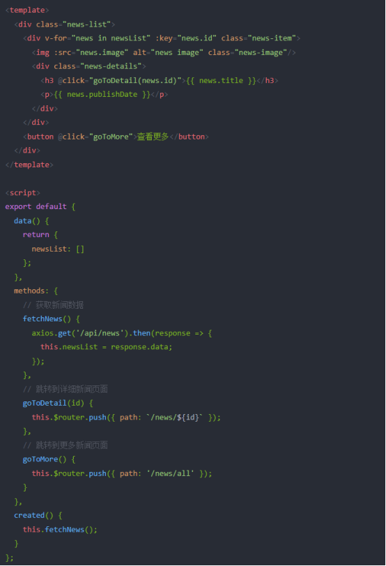 在首页展示球队的新闻资讯,点击标题进入详细页面,并提供更多新闻的按钮。