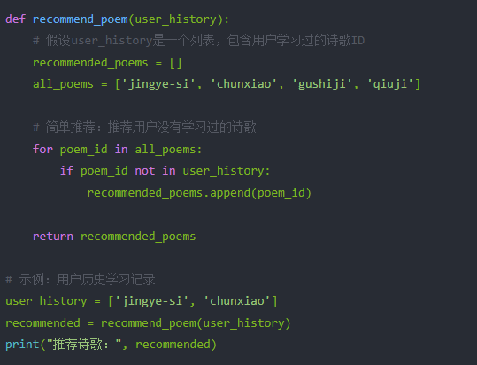 个性化推荐模块可以根据用户的学习进度来推荐诗歌。假设我们有一个数据库记录用户的学习历史,并根据他们的偏好来推荐相关诗歌。
