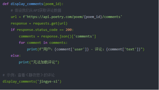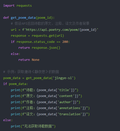 首先,我们需要展示诗歌的原文、注释和翻译。这个模块可以通过简单的接口来实现,假设我们通过一个API获取诗歌数据。