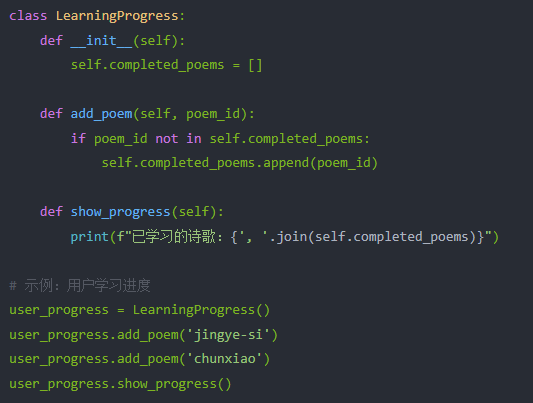 通过简单的代码和功能实现,我们能够构建一个完整的诗歌学习小助手,并通过抖音平台的吸引力来吸引更多用户参与。结合文案和功能,可以让用户不仅学到诗歌,还能够享受社交互动和学习进度展示的乐趣。
