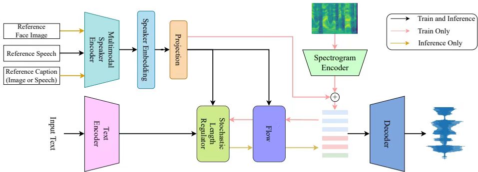 方法:设计跨模态对齐损失,通过权重共享分类模块实现基础语义关联,结合相似性矩阵蒸馏迁移教师模型知识,实现面部、文本或语音输入任意组合的灵活控制生成,支持多模态条件驱动的语音合成输出。