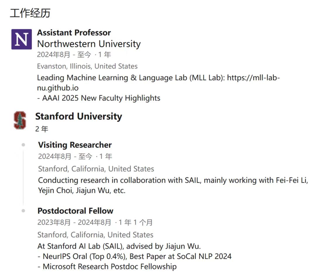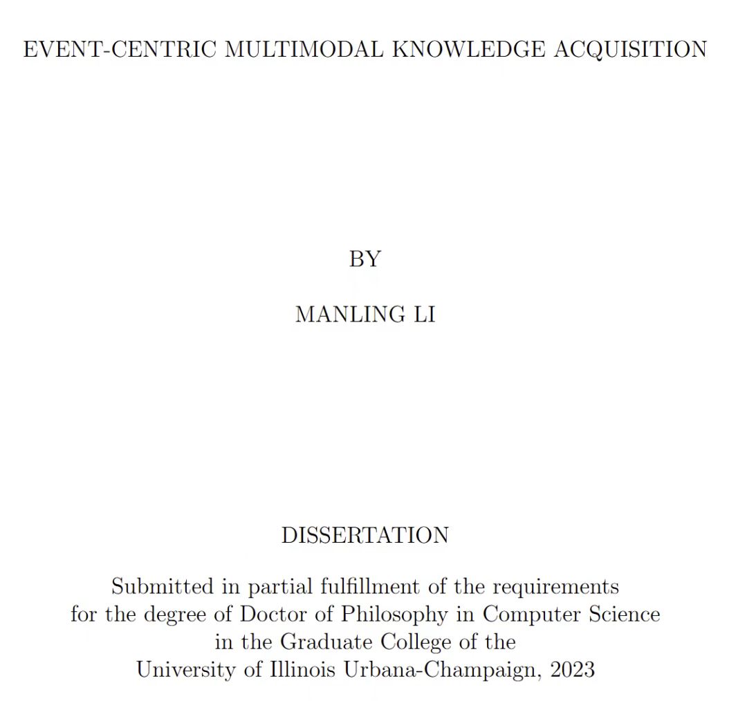 本文作者李曼玲(Manling Li)于 2023 年毕业于 UIUC,计算机科学 PhD,导师是季姮(Heng Ji)。根据其领英信息,2023 年 8 月 - 2024 年 8 月,李曼玲在斯坦福大学人工智能实验室任博士后研究员。