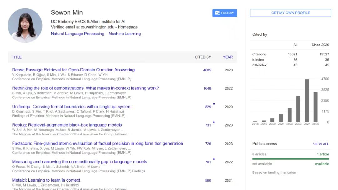 Sewon Min 本科毕业于首尔大学,2024 年在华盛顿大学拿到博士学位,现在在加州大学伯克利分校电气工程与计算机科学系(EECS)担任助理教授。Google Scholar 上的数据量显示,她的论文被引量已经过万。