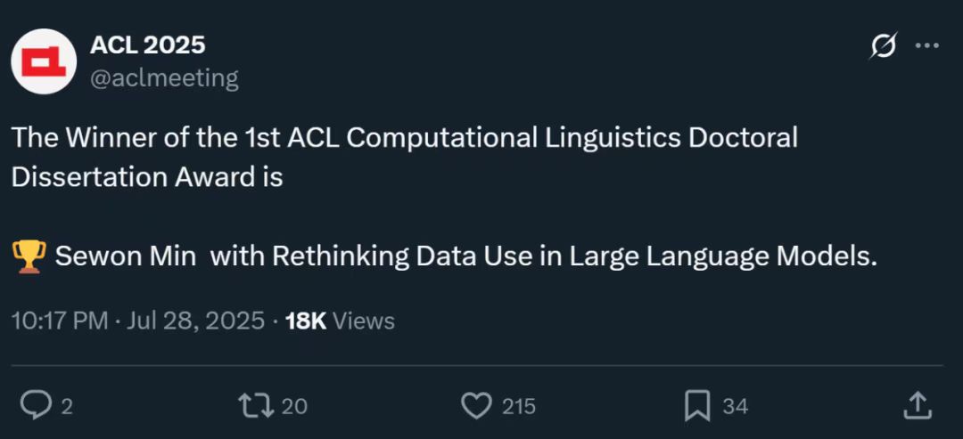这个奖项是今年新增的,获奖者是来自美国华盛顿大学的 Sewon Min。她的博士论文题为「Rethinking Data Use in Large Language Models(重新思考大型语言模型中的数据使用)」。