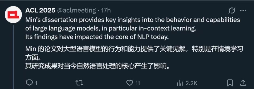 ACL 大会官方表示,「Min 的论文对大型语言模型的行为和能力提供了关键见解,特别是在上下文学习(in context learning)方面。 其研究成果对当今自然语言处理的核心产生了影响。