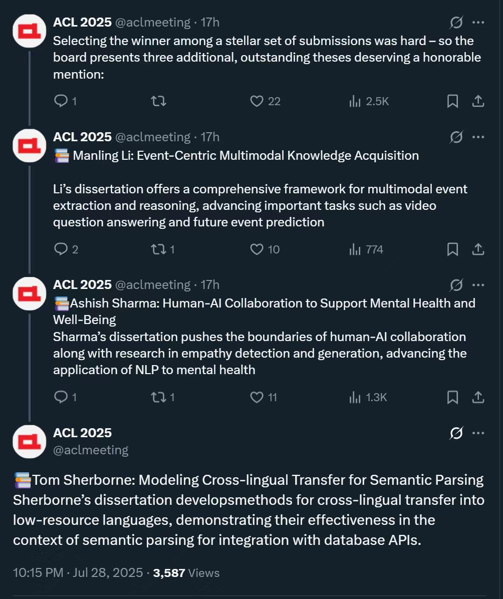 除了这篇获奖论文,ACL 大会官方还公布了三篇计算语言学博士论文奖提名,获奖者分别为伊利诺伊大学香槟分校博士李曼玲、华盛顿大学博士 Ashish Sharma 和爱丁堡大学博士 Thomas Rishi Sherborne。