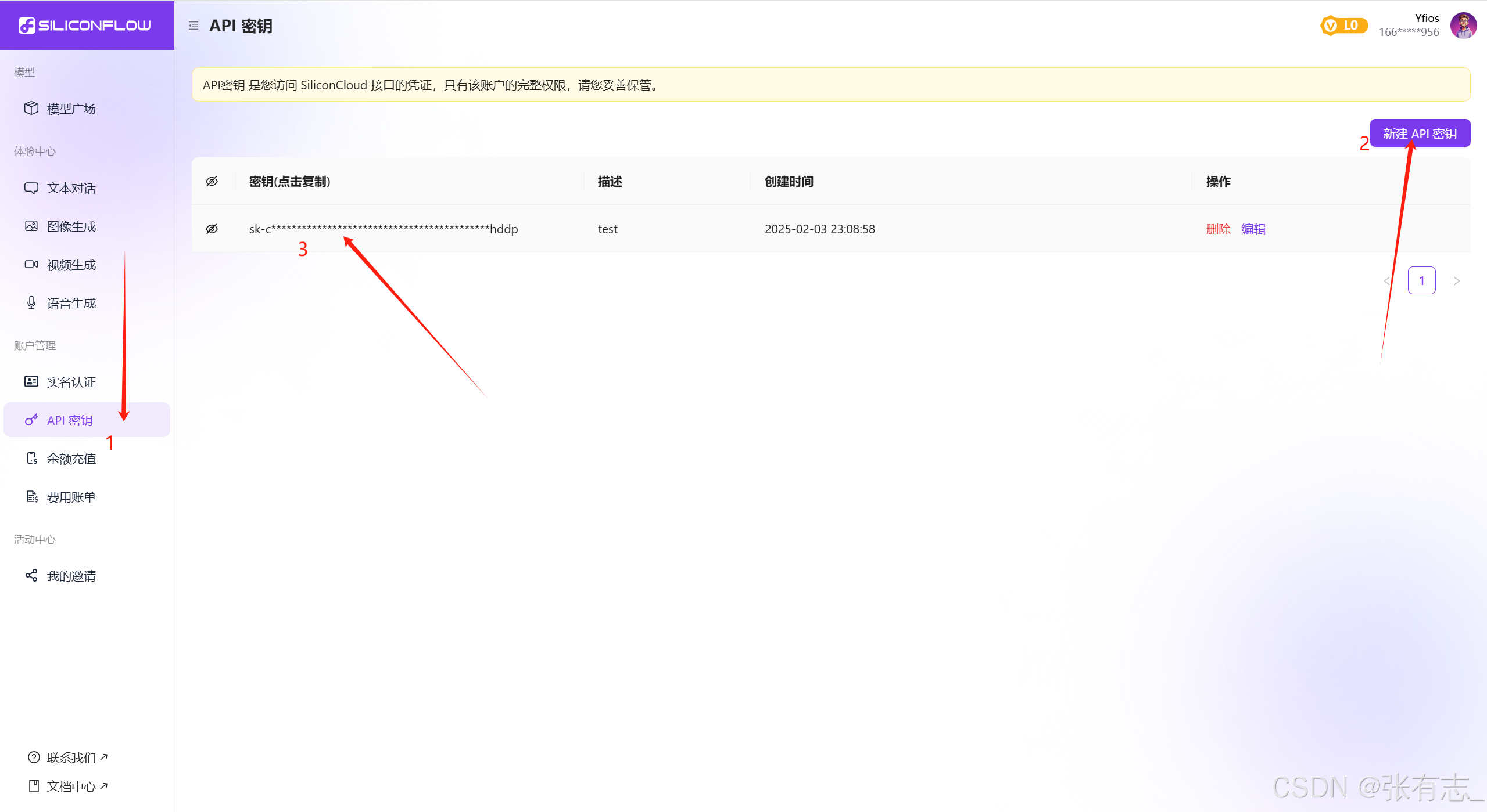 登录后,打开API密钥,新建一个API密钥,如下图这样,点击复制一下