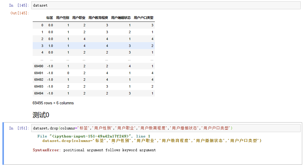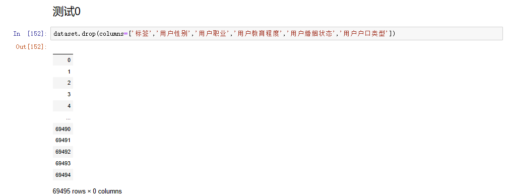 dataset.drop(columns=['标签','用户性别','用户职业','用户教育程度','用户婚姻状态','用户户口类型'])在其中添加了“[]”,就成功去除了