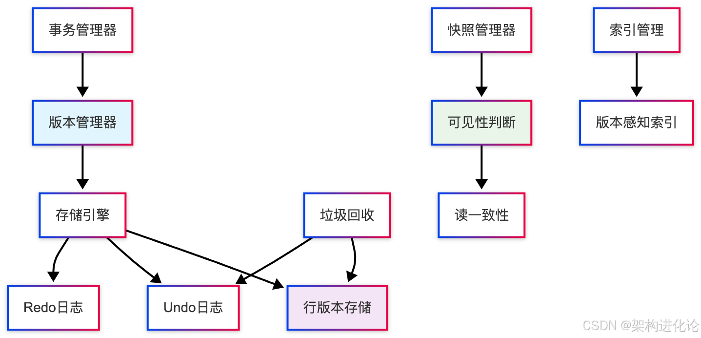 MVCC的实现需要数据库系统在多个层面进行协同设计,以下是其核心架构组件: