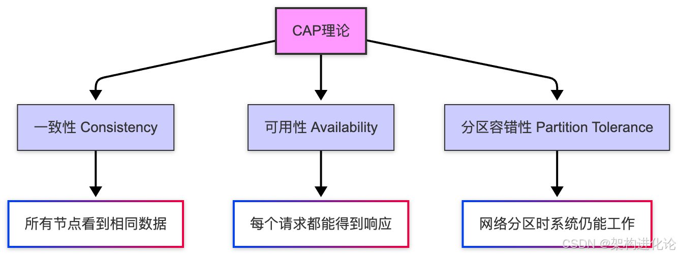 CAP理论由Eric Brewer提出,指出分布式系统最多只能同时满足一致性(Consistency)、可用性(Availability)和分区容错性(Partition tolerance)这三个特性中的两个。(扩展阅读:分布式系统数据一致性演进:从ACID到BASE的理论突破与实践创新、高可用系统架构设计实践:从设计到运营的全方位保障)