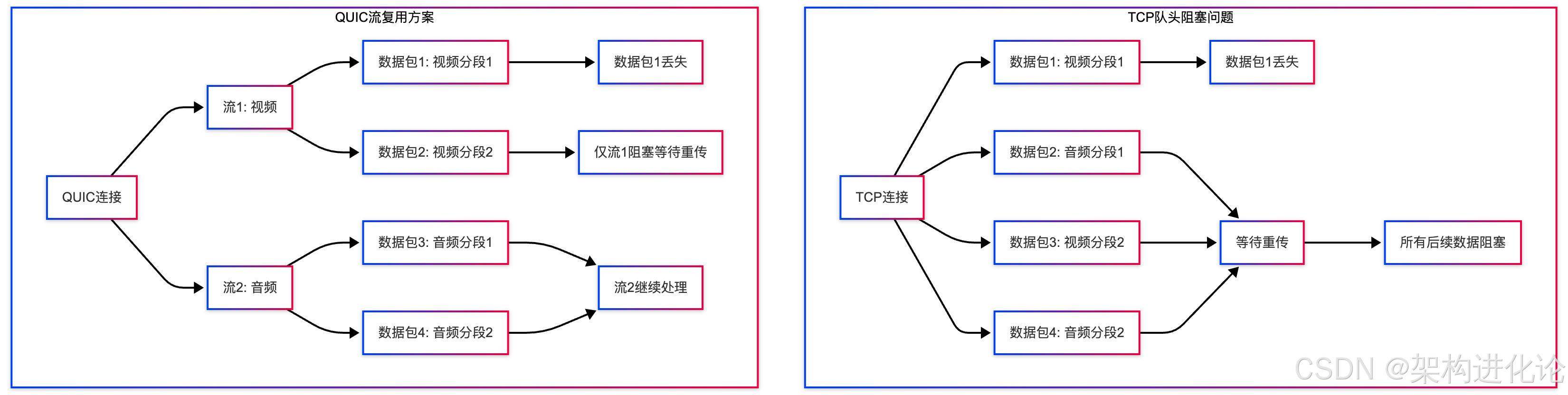队头阻塞(Head-of-Line Blocking):TCP严格保证数据按序交付,一旦某个数据包丢失或延迟,后续所有数据都必须等待,即使它们彼此独立。HTTP/2尝试通过多路复用解决此问题,但只是在应用层而非传输层,治标不治本。