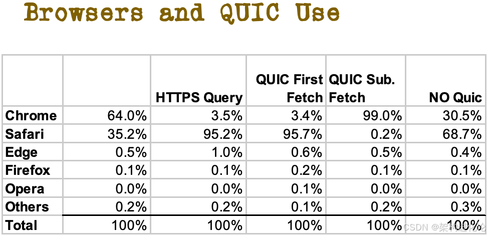 使用模式差异:Safari用户首次连接即倾向于使用QUIC,而Chrome用户则在后续连接中切换至QUIC。