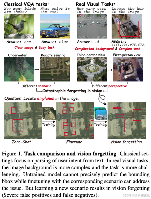 现实世界中的数据流通常由多种设备在不同区域采集,涵盖了多样的视角和环境。论文中构建的MSVQA数据集就包含了高空、水下、低空和室内四种不同场景和视角的数据,每种场景中的物体大小、密度、光照条件和遮挡情况都有显著差异。这些变化构成了一个极具挑战性的多场景持续学习环境,也反映了实际部署中模型需要应对的真实条件。