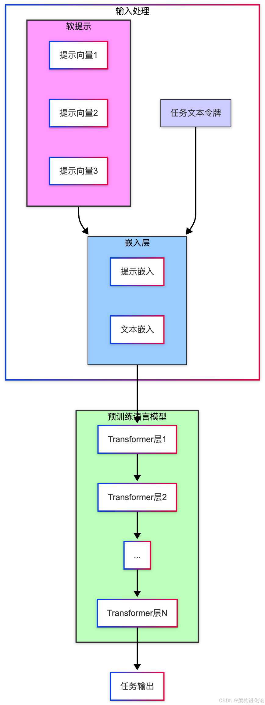 Prompt Tuning的架构设计体现了“最小侵入”原则,其核心思想是通过在输入序列前添加可训练的软提示向量,引导冻结的预训练模型执行特定任务。下图展示了Prompt Tuning的整体架构: