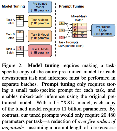 多任务学习方面,Prompt Tuning可以自然地扩展到多任务场景。通过为不同任务训练专用的提示向量,同时共享同一个预训练模型,可以实现高效的知识传递和存储。在这种设置下,部署N个任务仅需保存一个基础模型和N组提示向量,极大提升了存储效率。