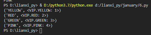 在Python中,枚举和我们在对象中定义的类变量时一样的,每一个类变量就是一个枚举项,访问枚举项的方式为:类名加上类变量,像下面这样: