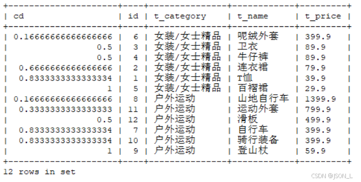 CUME_DIST() OVER(PARTITION BY t_category_id ORDER BY t_price DESC) AS cd,